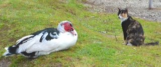 duck and a calico cat waiting for handouts from tourists to Furnas
