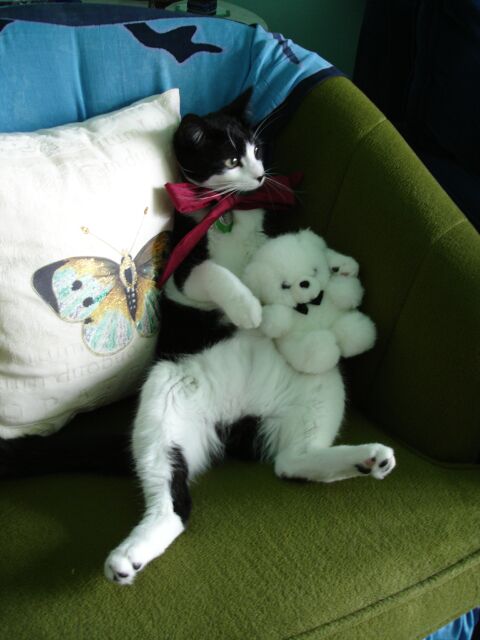 After having been taken from my mom and siblings, and spending more than a week alone in a metal cage at the Ottawa Humane Society, I realized just how lucky I was to be brought into this household. I have Bobbi all to myself, don't have to share food with anybody else, have a fountain that burbles fresh water into a little pool for me to drink out of, three (count them!) litter boxes (one upstairs, two downstairs), and lots of toys.